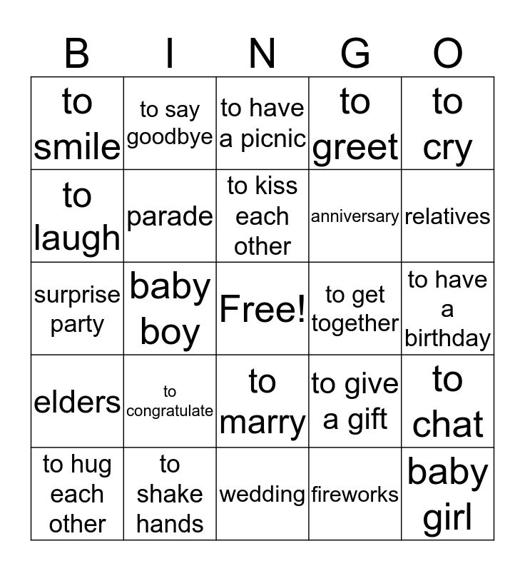 This bingo card has a free space and 24 words: to congratulate, to shake hands, to kiss each other, to hug each other, to cry, to smile, to laugh, to say goodbye, to get together, to marry, anniversary, surprise party, to give a gift, to chat, parade, fireworks, to have a birthday, to have a picnic, relatives, baby boy, baby girl, elders, to greet and wedding.