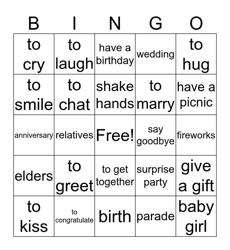 This bingo card has a free space and 24 words: to greet, to congratulate, shake hands, to kiss, to hug, to cry, to smile, to laugh, say goodbye, to get together, to marry, anniversary, surprise party, give a gift, to chat, parade, fireworks, have a birthday, have a picnic, relatives, baby girl, elders, wedding and birth.