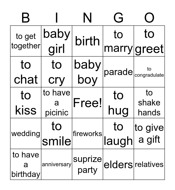 This bingo card has a free space and 24 words: to smile, anniversary, baby boy, to have a birthday, to greet, to get together, to chat, baby girl, to hug, fireworks, parade, to kiss, to laugh, to give a gift, to cry, elders, to shake hands, birth, to congradulate, to have a picinic, relatives, wedding, to marry and suprize party.