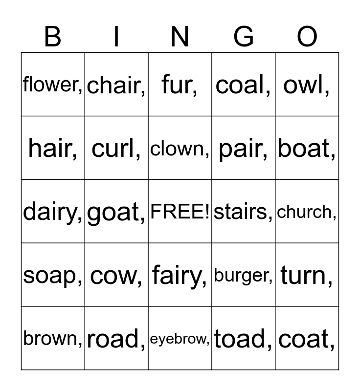This bingo card has a free space and 25 words: cow,, eyebrow,, clown,, brown,, owl,, flower,, hair,, chair,, stairs,, fairy,, pair,, dairy,, burger,, turn,, curl,, nurse,, church,, fur,, boat,, goat,, coat,, road,, soap,, coal, and toad,.