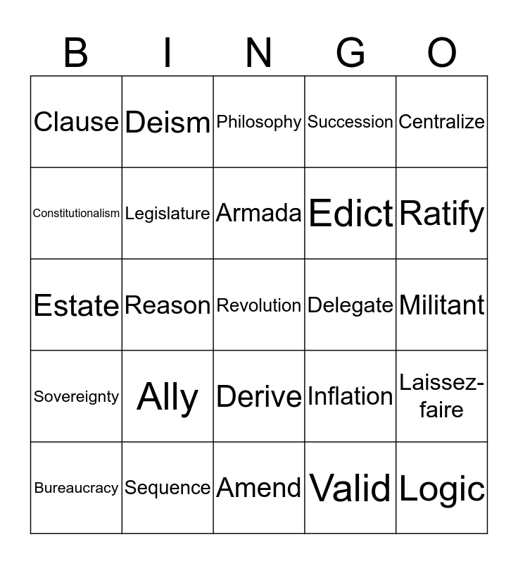 This bingo card has 25 words: Ally, Amend, Armada, Bureaucracy, Centralize, Clause, Constitutionalism, Deism, Delegate, Derive, Edict, Estate, Inflation, Laissez-faire, Legislature, Logic, Militant, Philosophy, Ratify, Reason, Revolution, Sequence, Sovereignty, Succession and Valid.