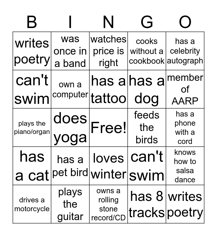 This bingo card has a free space and 24 words: has a pet bird, plays the guitar, has a tattoo, drives a motorcycle, has a celebrity autograph, writes poetry, can't swim, was once in a band, feeds the birds, loves winter, has a dog, plays the piano/organ, can't swim, knows how to salsa dance, own a computer, has 8 tracks, has a phone with a cord, watches price is right, member of AARP, does yoga, writes poetry, has a cat, cooks without a cookbook and owns a rolling stone record/CD.