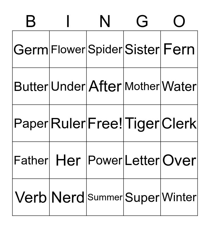 This bingo card has a free space and 24 words: Her, Nerd, After, Verb, Fern, Germ, Butter, Flower, Tiger, Power, Mother, Paper, Letter, Over, Under, Super, Clerk, Spider, Water, Ruler, Winter, Father, Sister and Summer.