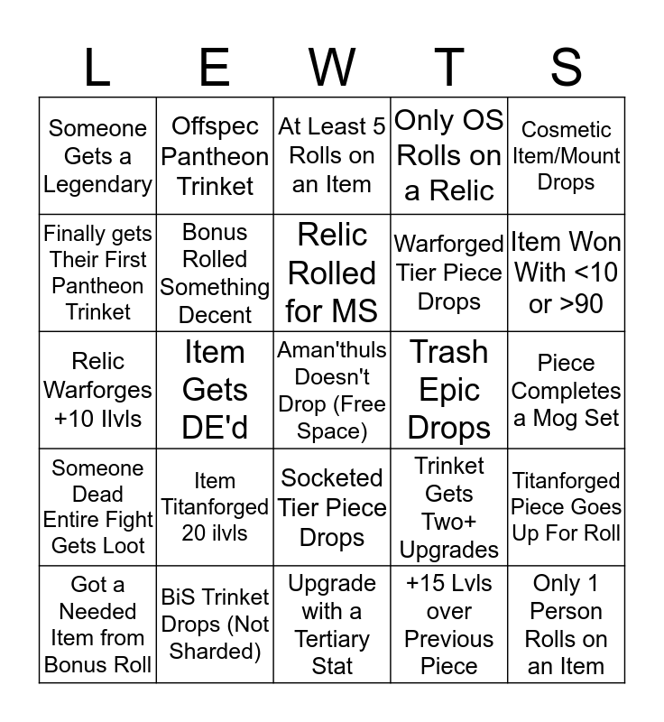 This bingo card has a free space and 24 words: Item Titanforged 20 ilvls, BiS Trinket Drops (Not Sharded), Relic Rolled for MS, Got a Needed Item from Bonus Roll, Cosmetic Item/Mount Drops, Someone Gets a Legendary, Finally gets Their First Pantheon Trinket, Offspec Pantheon Trinket, Trash Epic Drops, Socketed Tier Piece Drops, Warforged Tier Piece Drops, Relic Warforges +10 Ilvls, Trinket Gets Two+ Upgrades, Titanforged Piece Goes Up For Roll, Bonus Rolled Something Decent, +15 Lvls over Previous Piece, Piece Completes a Mog Set, At Least 5 Rolls on an Item, Item Won With <10 or >90, Item Gets DE'd, Only 1 Person Rolls on an Item, Someone Dead Entire Fight Gets Loot, Only OS Rolls on a Relic and Upgrade with a Tertiary Stat.