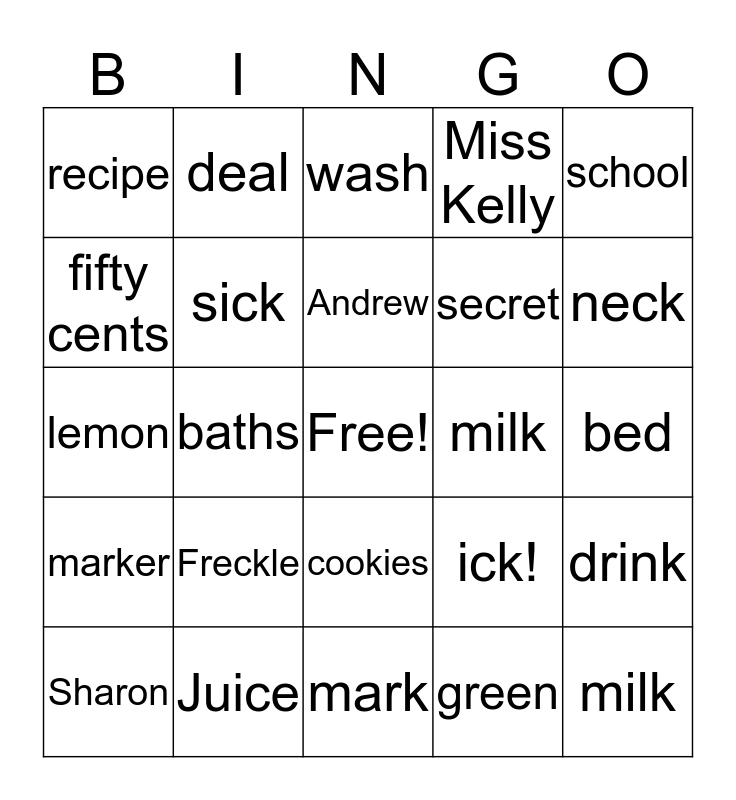 This bingo card has a free space and 24 words: Freckle, Juice, Andrew, Sharon, school, recipe, fifty cents, deal, milk, cookies, secret, lemon, ick!, drink, sick, green, bed, wash, neck, baths, milk, marker, Miss Kelly and mark.