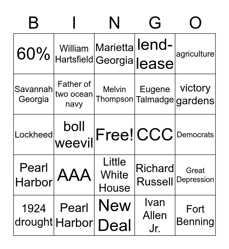 This bingo card has a free space and 24 words: AAA, Pearl Harbor, Melvin Thompson, 1924 drought, agriculture, 60%, Savannah Georgia, William Hartsfield, CCC, Little White House, Eugene Talmadge, Lockheed, Richard Russell, Great Depression, Father of two ocean navy, Ivan Allen Jr., Democrats, Marietta Georgia, victory gardens, boll weevil, Fort Benning, Pearl Harbor, lend-lease and New Deal.