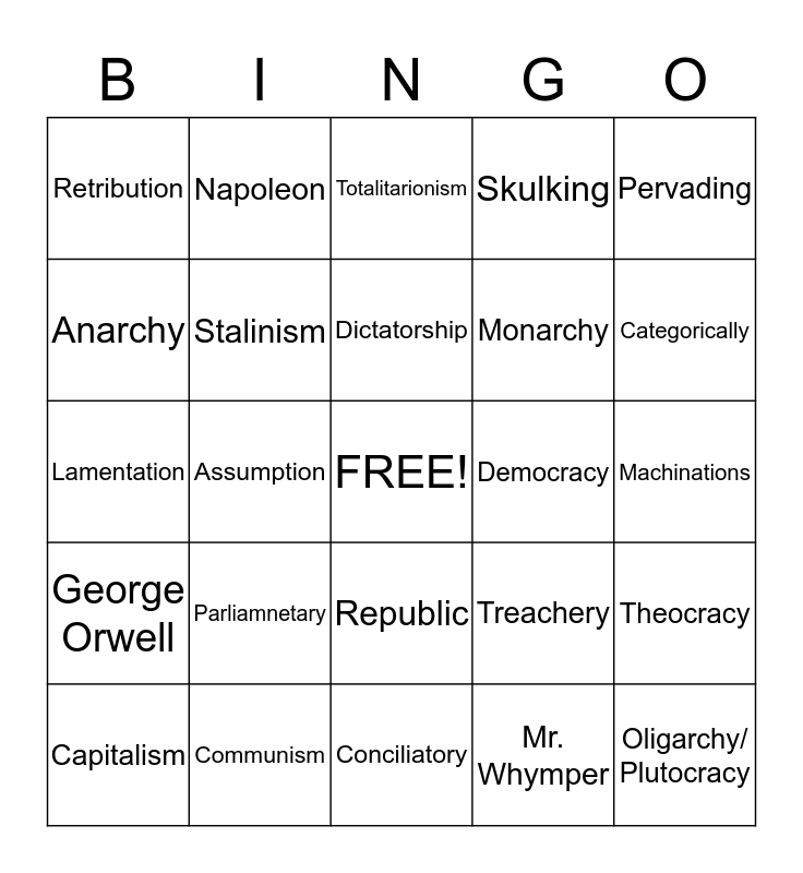 This bingo card has a free space and 24 words: Parliamnetary, Communism, Dictatorship, Capitalism, Pervading, Retribution, Anarchy, Napoleon, Democracy, Republic, Monarchy, Lamentation, Treachery, Theocracy, Stalinism, Mr. Whymper, Machinations, Totalitarionism, Categorically, Assumption, Oligarchy/ Plutocracy, George Orwell, Skulking and Conciliatory.