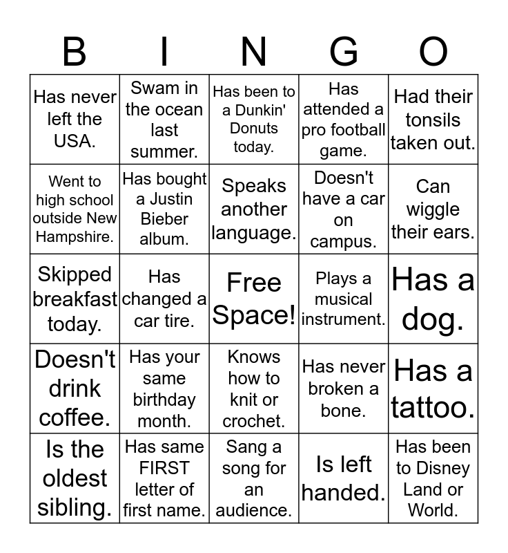 This bingo card has a free space and 24 words: Has your same birthday month., Has same FIRST letter of first name., Speaks another language., Is the oldest sibling., Had their tonsils taken out., Has never left the USA., Went to high school outside New Hampshire., Swam in the ocean last summer., Plays a musical instrument., Knows how to knit or crochet., Doesn't have a car on campus., Skipped breakfast today., Has never broken a bone., Has a tattoo., Has bought a Justin Bieber album., Is left handed., Has a dog., Has been to a Dunkin' Donuts today., Can wiggle their ears., Has changed a car tire., Has been to Disney Land or World., Doesn't drink coffee., Has attended a pro football game. and Sang a song for an audience..
