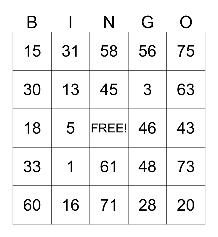 This bingo card has a free space and 24 words: 1, 16, 45, 60, 75, 15, 30, 31, 46, 61, 3, 18, 48, 73, 13, 28, 43, 58, 63, 5, 20, 33, 56 and 71.