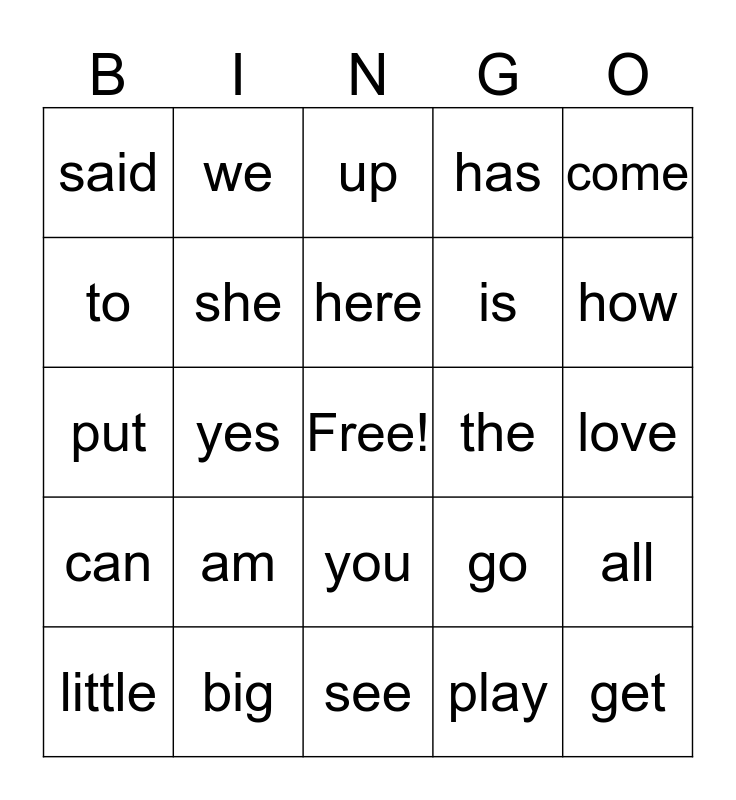 This bingo card has a free space and 27 words: go, on, is, see, to, up, we, can, the, all, put, has, little, big, how, are, she, here, am, said, love, play, yes, get, you, come and with.