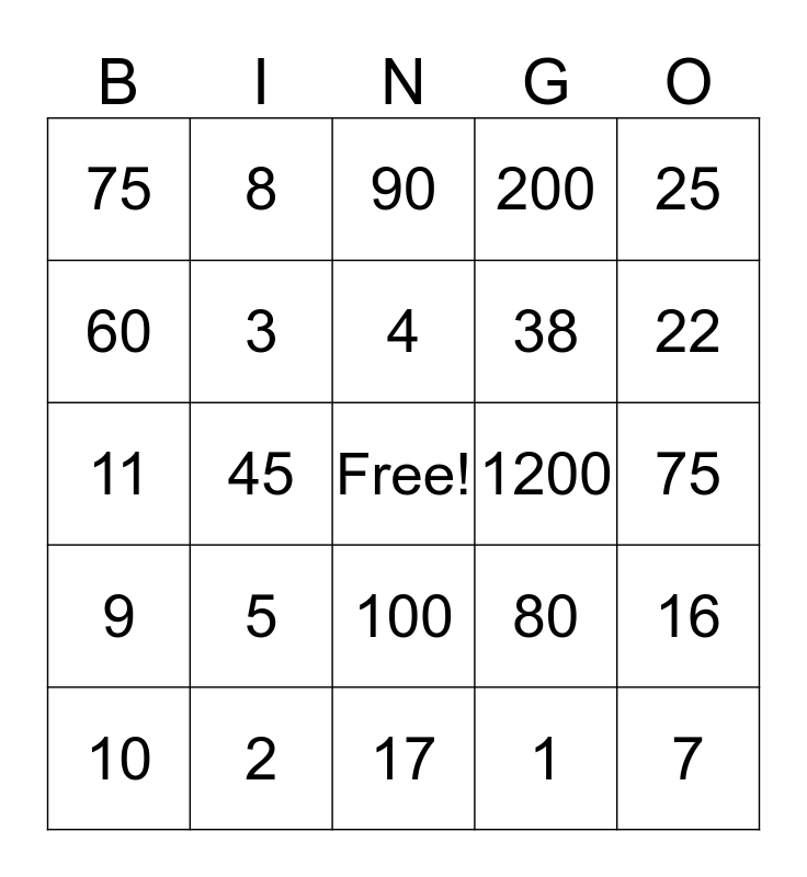 This bingo card has a free space and 24 words: 5, 2, 4, 10, 25, 75, 60, 8, 1200, 100, 38, 11, 80, 16, 3, 1, 75, 90, 22, 45, 7, 9, 200 and 17.
