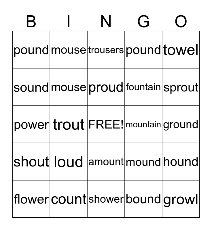 This bingo card has a free space and 24 words: loud, count, proud, flower, towel, pound, sound, mouse, mountain, amount, fountain, power, mound, hound, mouse, bound, ground, trousers, sprout, trout, growl, shout, pound and shower.