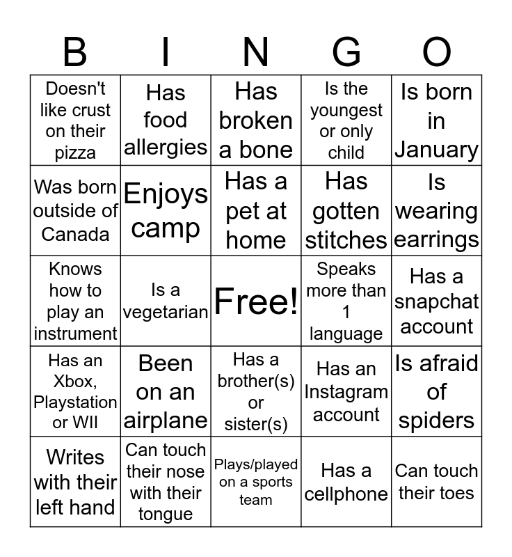 This bingo card has a free space and 24 words: Been on an airplane, Can touch their nose with their tongue, Has a pet at home, Writes with their left hand, Is born in January, Doesn't like crust on their pizza, Was born outside of Canada, Has food allergies, Speaks more than 1 language, Has a brother(s) or sister(s), Has gotten stitches, Knows how to play an instrument, Has an Instagram account, Is afraid of spiders, Enjoys camp, Has a cellphone, Has a snapchat account, Has broken a bone, Is wearing earrings, Is a vegetarian, Can touch their toes, Has an Xbox, Playstation or WII, Is the youngest or only child and Plays/played on a sports team.