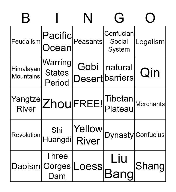 This bingo card has a free space and 24 words: Shi Huangdi, Three Gorges Dam, Gobi Desert, Daoism, Legalism, Feudalism, Himalayan Mountains, Pacific Ocean, Tibetan Plateau, Yellow River, natural barriers, Yangtze River, Dynasty, Confucius, Warring States Period, Liu Bang, Merchants, Peasants, Qin, Zhou, Shang, Revolution, Confucian Social System and Loess.