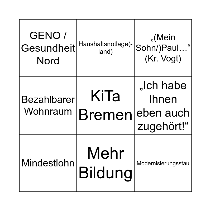 This bingo card has 24 words: „Sind Sie bereit, zur Kenntnis zu nehmen, dass …“, „Soweit die Antwort des Senats.“, Mehr Bildung, Klinikum Bremen-Mitte, KiTa Bremen, GENO / Gesundheit Nord, „Ich habe Ihnen eben auch zugehört!“, Haushaltsnotlage(-land), Haushaltskonsolidierung, Schuldenbremse, Modernisierungsstau, „Sie waren es doch, die/der zu Zeiten der großen Koalition ...“, „Wir als …-Fraktion lehnen den Antrag ab.“, OTB / Offshore Terminal Bremerhaven, Mindestlohn, „in keinster Weise“, „richtig und wichtig“, „(Mein Sohn/)Paul…“ (Kr. Vogt), Unbegleitete minderjährige/-r Flüchtlinge/Ausländer, „Ich komme zum Schluss.“, Digitalisierung, Bürokratieabbau, Bezahlbarer Wohnraum and GEWOBA.