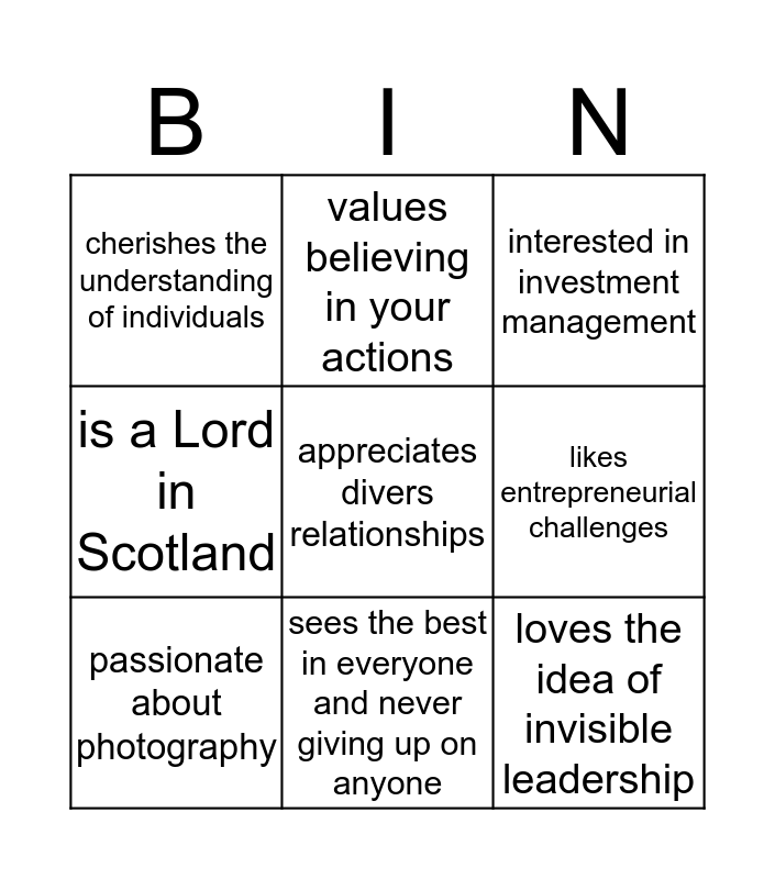 This bingo card has 9 words: passionate about photography, interested in investment management, values believing in your actions, is a Lord in Scotland, cherishes the understanding of individuals, likes entrepreneurial challenges, appreciates divers relationships, loves the idea of invisible leadership and sees the best in everyone and never giving up on anyone.