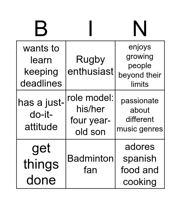 This bingo card has 9 words: get things done, enjoys growing people beyond their limits, Rugby enthusiast, has a just-do-it-attitude, wants to learn keeping deadlines, passionate about different music genres, role model: his/her four year-old son, adores spanish food and cooking and Badminton fan.