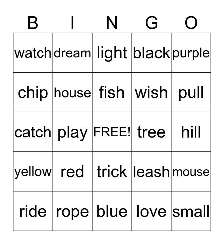 This bingo card has a free space and 24 words: red, rope, fish, ride, purple, watch, chip, dream, tree, trick, wish, catch, leash, mouse, house, love, hill, light, pull, play, small, yellow, black and blue.
