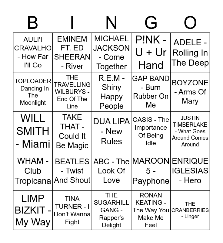 This bingo card has 45 words: ETERNAL - Power Of A Woman, DUA LIPA - New Rules, OLLY MURS FT. LOUISA JOHNSON - Unpredictable, LIMP BIZKIT - My Way, LITTLE MIX FT. STORMZY - Power, RONAN KEATING - The Way You Make Me Feel, MICHAEL JACKSON - Come Together, MIKA - Happy Ending, ADELE - Rolling In The Deep, TINA TURNER - I Don't Wanna Fight, P!NK - U + Ur Hand, OASIS - The Importance Of Being Idle, ABC - The Look Of Love, BEATLES - Twist And Shout, BEE GEES - I Started A Joke, THE SUGARHILL GANG - Rapper's Delight, CHRIS DeBURGH - Lady In Red, WILL SMITH - Miami, THE BEACH BOYS - Wouldn't It Be Nice, BOYZONE - Arms Of Mary, EMINEM FT. ED SHEERAN - River, BRITNEY SPEARS - Sometimes, PICTURE THIS - You & I, AULI'I CRAVALHO - How Far I'll Go, BLACK EYED PEAS - Let's Get It Started, JUSTIN TIMBERLAKE - What Goes Around Comes Around, BEYONCE - Halo, ONE REPUBLIC - Stop And Stare, MAROON 5 - Payphone, WHAM - Club Tropicana, MADONNA - La Isla Bonita, ENRIQUE IGLESIAS - Hero, CHUCK BERRY - Johnny B. Goode, THE JON SPENCER BLUES EXPLOSION - Bellbottoms, WESTLIFE - What Makes A Man, TAKE THAT - Could It Be Magic, PAUL SHAFFER - Roll Over Beethoven, KYLIE MINOGUE - Spinning Around, THE CRANBERRIES - Linger, R.E.M - Shiny Happy People, TOPLOADER - Dancing In The Moonlight, GAP BAND - Burn Rubber On Me, FIVE - Everybody Get Up, THE TRAVELLING WILBURYS - End Of The Line and ANNIE LENNOX - Little Bird.
