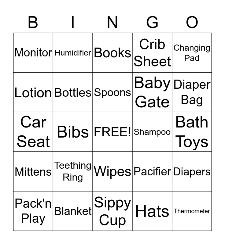 This bingo card has a free space and 24 words: Teething Ring, Blanket, Spoons, Pack'n Play, Changing Pad, Monitor, Lotion, Humidifier, Shampoo, Wipes, Baby Gate, Car Seat, Pacifier, Diapers, Bottles, Hats, Bath Toys, Books, Diaper Bag, Bibs, Thermometer, Mittens, Crib Sheet and Sippy Cup.