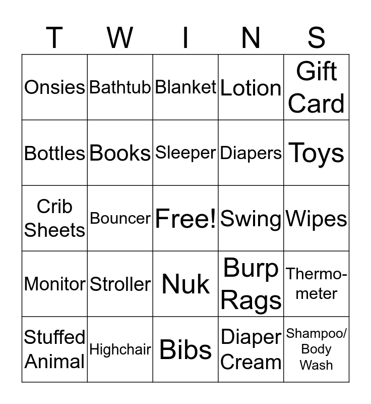 This bingo card has a free space and 24 words: Stroller, Highchair, Sleeper, Stuffed Animal, Gift Card, Onsies, Bottles, Bathtub, Swing, Nuk, Diapers, Crib Sheets, Burp Rags, Thermo-meter, Books, Diaper Cream, Wipes, Blanket, Toys, Bouncer, Shampoo/ Body Wash, Monitor, Lotion and Bibs.