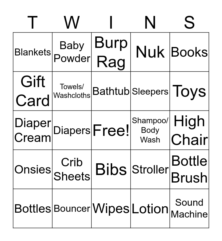 This bingo card has a free space and 24 words: Crib Sheets, Bouncer, Bathtub, Bottles, Books, Blankets, Gift Card, Baby Powder, Shampoo/ Body Wash, Bibs, Sleepers, Diaper Cream, Stroller, Bottle Brush, Towels/ Washcloths, Lotion, High Chair, Burp Rag, Toys, Diapers, Sound Machine, Onsies, Nuk and Wipes.