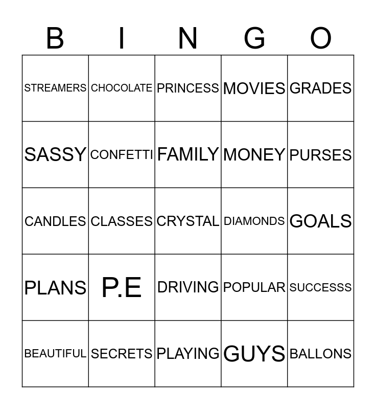 This bingo card has a free space and 24 words: BEAUTIFUL, P.E, FAMILY, GUYS, GRADES, STREAMERS, CHOCOLATE, PRINCESS, DIAMONDS, GOALS, CANDLES, CONFETTI, POPULAR, SUCCESSS, SASSY, SECRETS, PLAYING, MOVIES, PURSES, PLANS, CLASSES, DRIVING, MONEY and BALLONS.