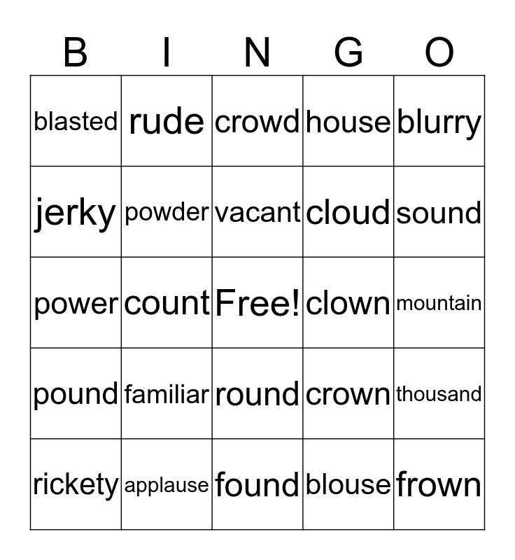 This bingo card has a free space and 24 words: familiar, applause, vacant, rickety, blurry, blasted, jerky, rude, clown, round, cloud, power, crown, thousand, powder, blouse, mountain, crowd, sound, count, frown, pound, house and found.