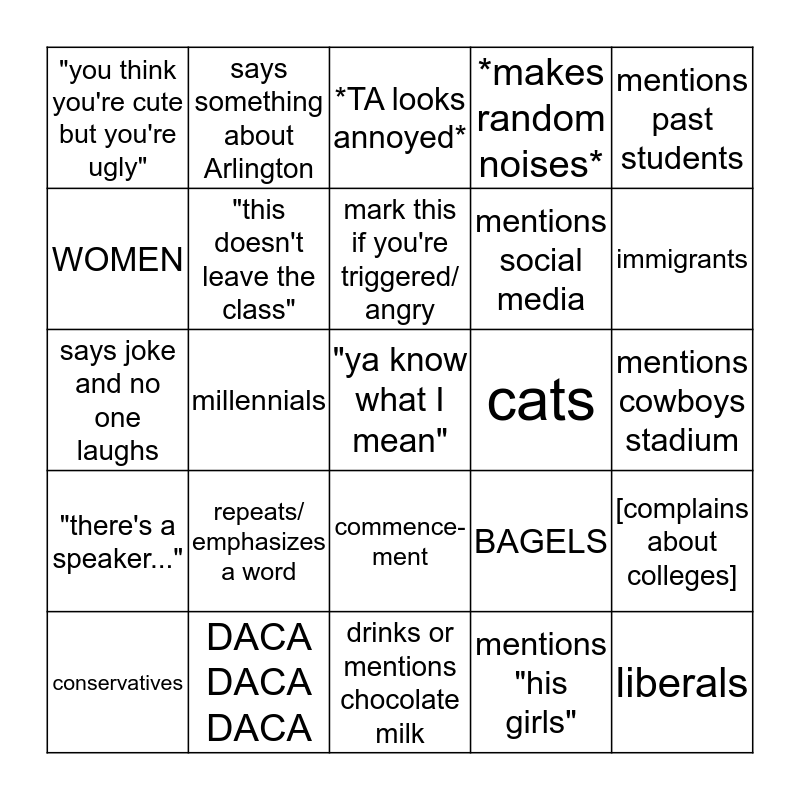 This bingo card has 25 words: repeats/ emphasizes a word, drinks or mentions chocolate milk, mark this if you're triggered/ angry, conservatives, mentions past students, "you think you're cute but you're ugly", WOMEN, says something about Arlington, cats, commence- ment, mentions social media, says joke and no one laughs, BAGELS, [complains about colleges], "this doesn't leave the class", liberals, mentions cowboys stadium, *TA looks annoyed*, immigrants, millennials, "ya know what I mean", DACA DACA DACA, "there's a speaker...", *makes random noises* and mentions "his girls".