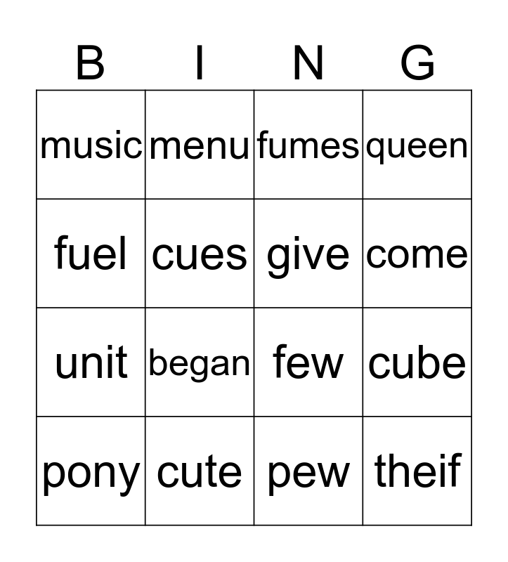 This bingo card has 16 words: cute, cube, fumes, music, unit, menu, few, pew, fuel, cues, pony, queen, began, come, give and theif.