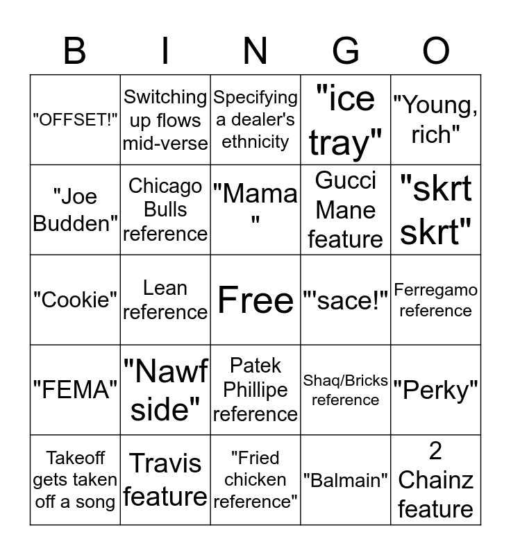 This bingo card has a free space and 24 words: "Nawf side", Travis feature, "Mama ", Takeoff gets taken off a song, "Young, rich", "OFFSET!", "Joe Budden", Switching up flows mid-verse, "'sace!", Patek Phillipe reference, Gucci Mane feature, "Cookie", Shaq/Bricks reference, "Perky", Chicago Bulls reference, "Balmain", Ferregamo reference, Specifying a dealer's ethnicity, "skrt skrt", Lean reference, 2 Chainz feature, "FEMA", "ice tray" and "Fried chicken reference".