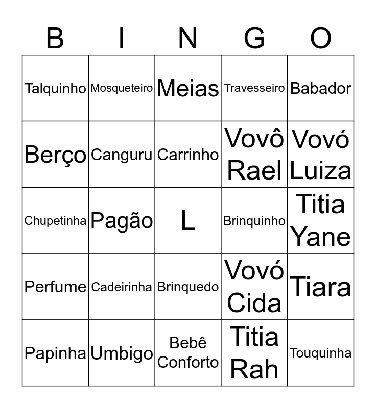 This bingo card has a free space and 75 words: Kit berço, Body, Meias, Macacão, Fralda, Pano de boca, Cueiro, Lençol, Mamadeira, Bico, Sabonete, Banheirinha, Carrinho, Berço, Alfinete, Pagão, Mantinha, Touquinha, Termômetro, Babador, Sapatinho, Chupetinha, Canguru, Mosqueteiro, Travesseiro, Casaquinho, Chocalho, Mobile, Trocador, Andador, Shampoozinho, Papai Ismael, Mamãe Tanise, Vovó Cida, Vovó Luiza, Vovô Rael, Vovô Zeli, Bebê, Titia Yane, Titia Rah, Titia Taci, Titio, Bisa Ana, Bisa Nadir, Bisavô Décio, Mingau, Papinha, Talquinho, Mordedor, Maternidade, Amamentação, Brinquedo, Lenço Umedecido, Galinha Pintadinha, Lady Bug, Show da Luna, Naruto, Princesa, Boneca, Protetor Solar, Cadeirinha, Repelente, Vestidinho, Sainha, Lacinho, Brinquinho, Pomada, Cobertor, Luvinha, Tiara, Perfume, Umbigo, Cartão de Vacina, Bebê Conforto and Creche.