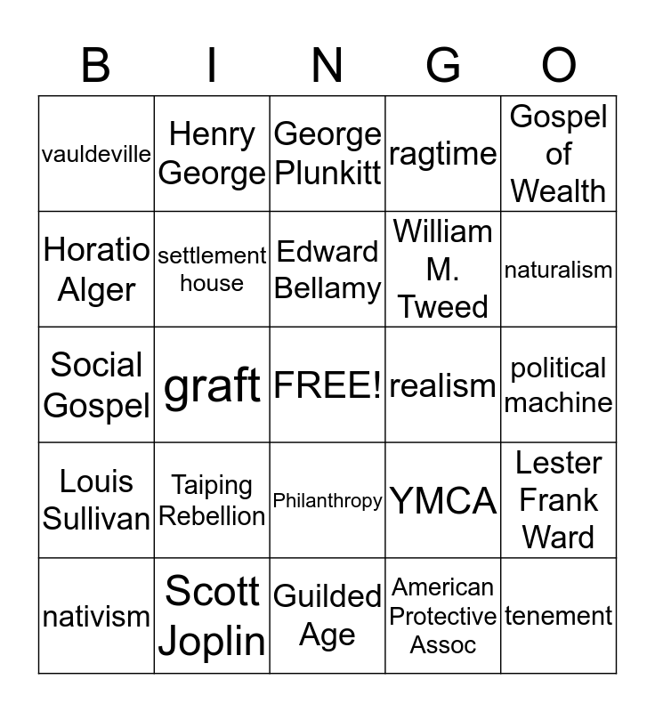 This bingo card has a free space and 37 words: Americanization, party boss, Herbert Spencer, settlement house, Lester Frank Ward, Taiping Rebellion, Edward Bellamy, Skyscraper, Gospel of Wealth, Chinese Exclusion Act, graft, ragtime, tenement, political machine, Horatio Alger, Louis Sullivan, Ellis Island, George Plunkitt, Philanthropy, realism, vauldeville, naturalism, nativism, Guilded Age, steerage, American Protective Assoc, Henry George, Angel Island, Jacob Riis, Jane Addams, Social Darwinsim, Scott Joplin, Social Gospel, Workingman's Party of Cal, YMCA, William M. Tweed and D.L. Moody.