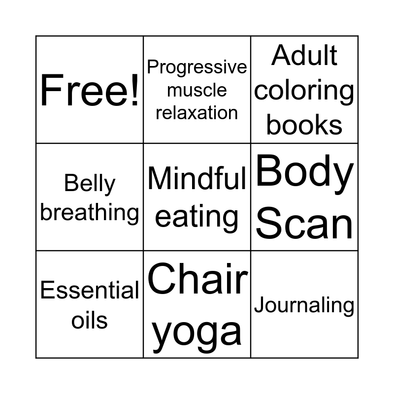 This bingo card has a free space and 8 words: Body Scan, Adult coloring books, Progressive muscle relaxation, Essential oils, Free!, Journaling, Belly breathing and Chair yoga.