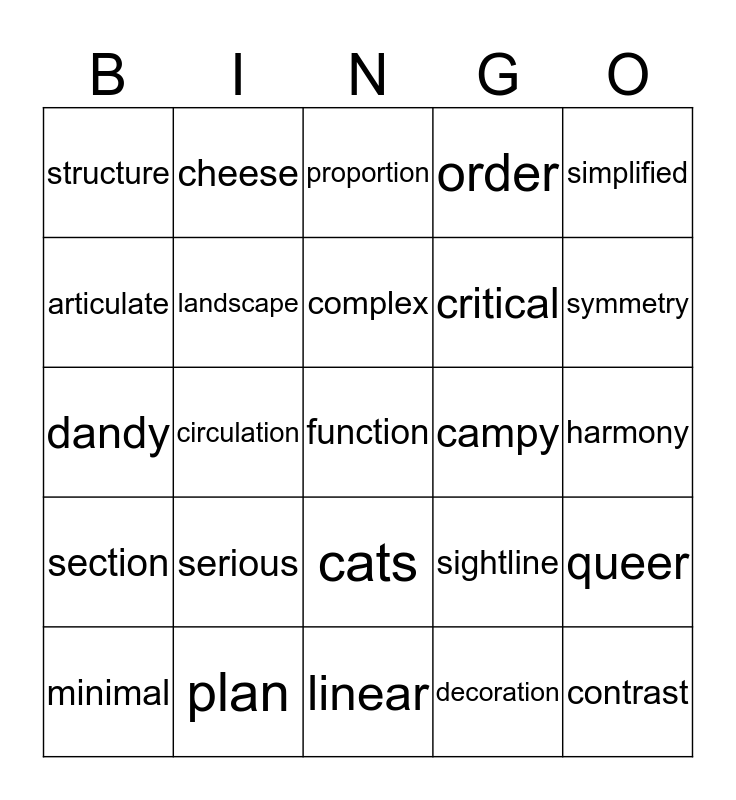This bingo card has 25 words: serious, linear, complex, minimal, simplified, structure, articulate, cheese, campy, cats, critical, dandy, sightline, queer, landscape, contrast, harmony, proportion, symmetry, circulation, function, plan, section, order and decoration.