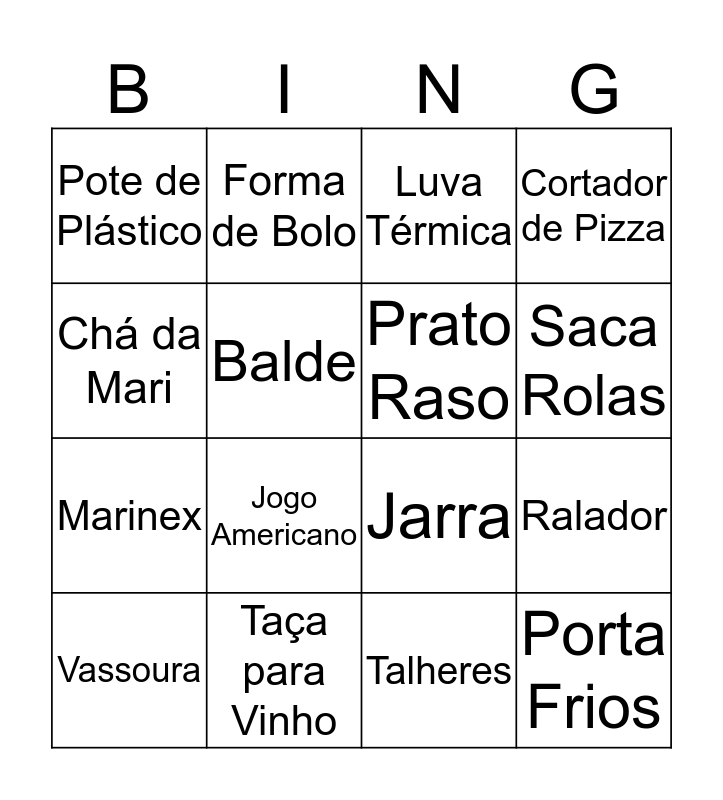 This bingo card has 16 words: Taça para Vinho, Ralador, Luva Térmica, Pote de Plástico, Marinex, Forma de Bolo, Jarra, Talheres, Chá da Mari, Balde, Vassoura, Cortador de Pizza, Jogo Americano, Saca Rolas, Prato Raso and Porta Frios.