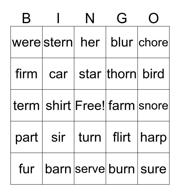 This bingo card has a free space and 24 words: sir, barn, star, fur, chore, were, firm, stern, farm, turn, thorn, term, flirt, harp, car, burn, snore, her, bird, shirt, sure, part, blur and serve.