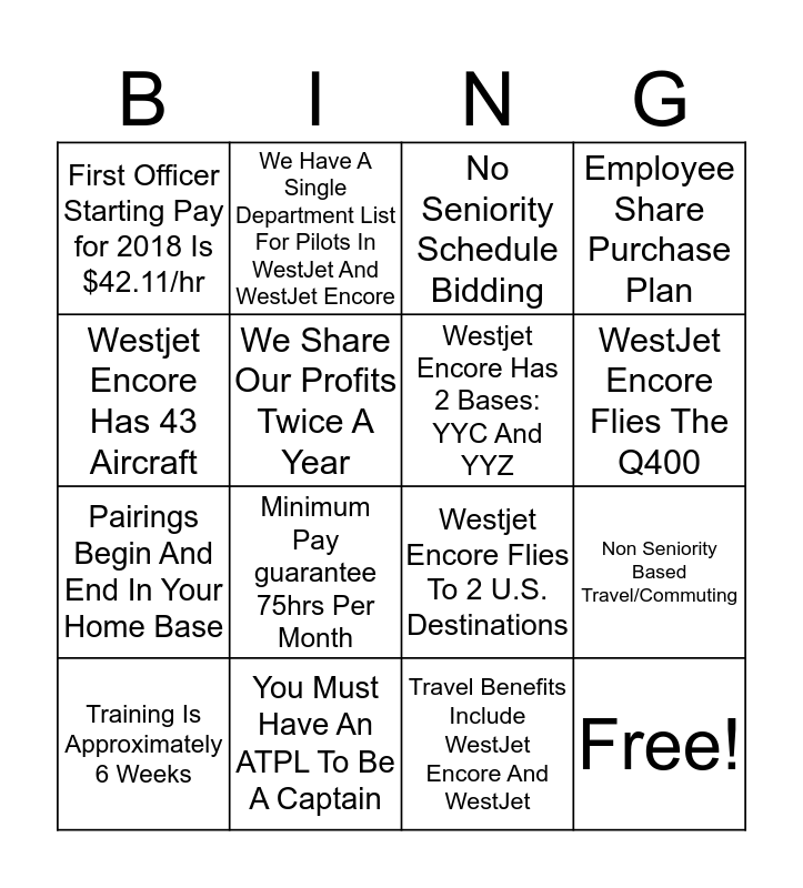 This bingo card has 23 words: Free!, WestJet Encore’s Birthday Is June 24th, WestJet Encore Flies The Q400, WestJet Encore Flies To 37 Destinations, Westjet Encore Has 43 Aircraft, First Officer Starting Pay for 2018 Is $42.11/hr, We Share Our Profits Twice A Year, We Have A Single Department List For Pilots In WestJet And WestJet Encore, Training Is Approximately 6 Weeks, Scheduled 18 Days Per Month Of Work, Minimum Pay guarantee 75hrs Per Month, Pairings Begin And End In Your Home Base, Minimum 50% Flow Through For WestJet Encore Pilots To WestJet, You Must Have 1000hrs Total Time To Be A First Officer At WestJet Encore, You Must Have An ATPL To Be A Captain, Available Crew Member Policy Allows Pilots To Travel For Free To And From Work, No Seniority Schedule Bidding, Westjet Encore Flies To 2 U.S. Destinations, Westjet Encore Has 2 Bases: YYC And YYZ, Non Seniority Based Travel/Commuting, Employee Share Purchase Plan, Travel Benefits Include WestJet Encore And WestJet and 2 Weeks Of Paid Vacation To Start.