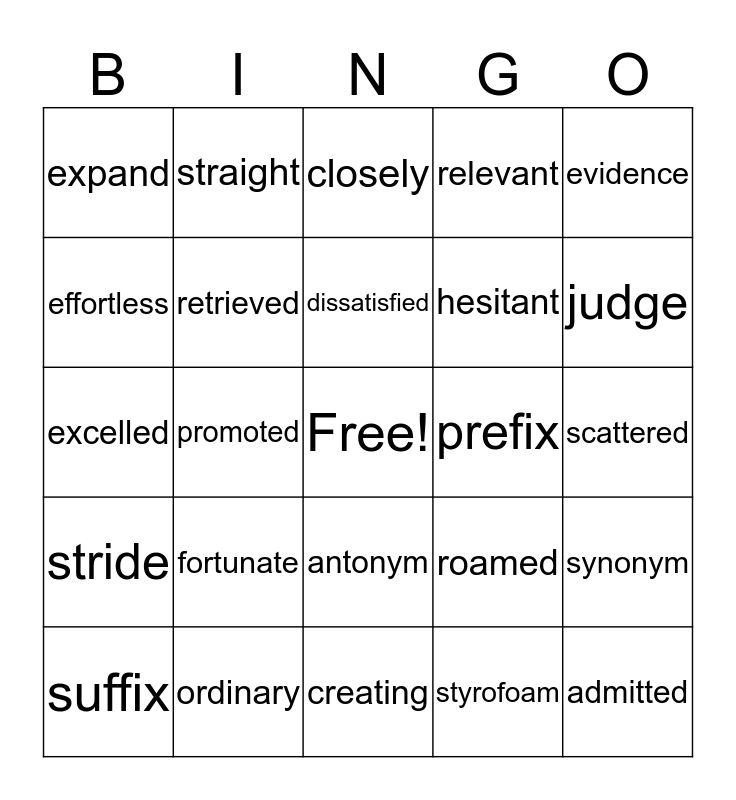 This bingo card has a free space and 24 words: fortunate, ordinary, dissatisfied, suffix, evidence, expand, effortless, straight, prefix, antonym, hesitant, excelled, roamed, synonym, retrieved, styrofoam, scattered, closely, judge, promoted, admitted, stride, relevant and creating.