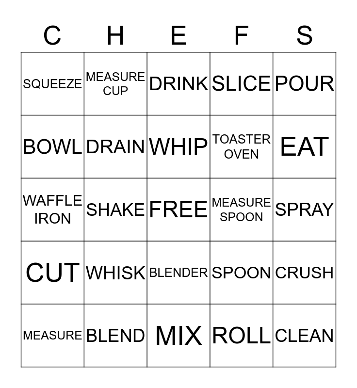 This bingo card has a free space and 24 words: WHISK, BLEND, WHIP, MEASURE, POUR, SQUEEZE, BOWL, MEASURE CUP, MEASURE SPOON, BLENDER, TOASTER OVEN, WAFFLE IRON, SPOON, CRUSH, DRAIN, ROLL, SPRAY, DRINK, EAT, SHAKE, CLEAN, CUT, SLICE and MIX.