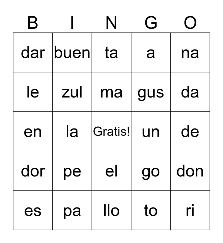 This bingo card has a free space and 24 words: pe, pa, ma, es, na, dar, le, buen, un, el, gus, en, go, don, zul, to, de, ta, da, la, ri, dor, a and llo.