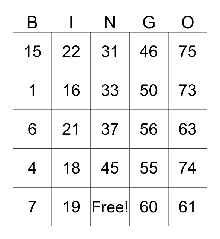 This bingo card has 25 words: 4, 19, 37, 60, 75, 15, 22, 31, 56, 74, 1, 16, Free!, 55, 73, 7, 21, 33, 50, 63, 6, 18, 45, 46 and 61.