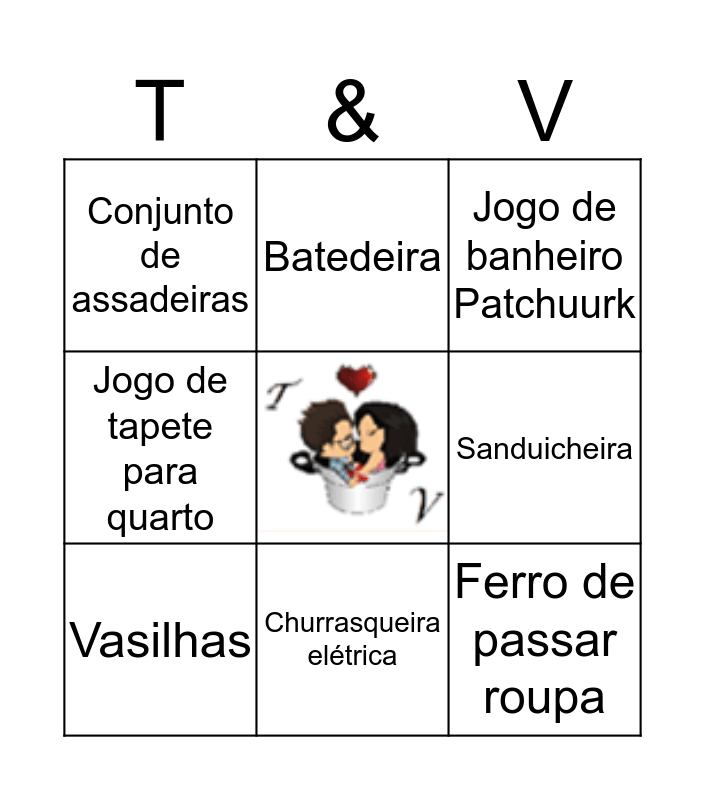 This bingo card has a free space and 9 words: Vasilhas, Jogo de banheiro Patchuurk, Batedeira, Jogo de tapete para quarto, Conjunto de assadeiras, Sanduicheira, Ferro de passar roupa, Lixeira inox and Churrasqueira elétrica.