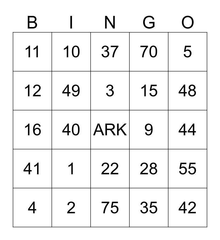This bingo card has a free space and 24 words: 1, 2, 3, 4, 5, 11, 12, 10, 9, 22, 15, 16, 28, 55, 49, 35, 44, 37, 48, 40, 42, 41, 70 and 75.