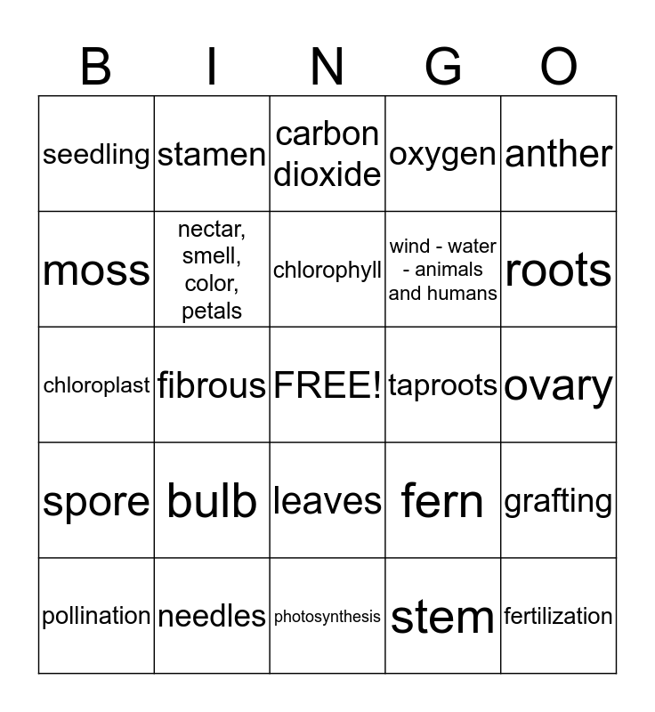 This bingo card has a free space and 24 words: bulb, needles, chlorophyll, pollination, anther, seedling, moss, stamen, taproots, leaves, wind - water - animals and humans, chloroplast, fern, grafting, nectar, smell, color, petals, stem, ovary, carbon dioxide, roots, fibrous, fertilization, spore, oxygen and photosynthesis.