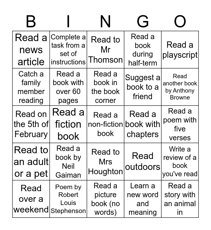 This bingo card has 25 words: Read a book by Neil Gaiman, Read a picture book (no words), Read a book in the book corner, Read over a weekend, Read a playscript, Read a news article, Catch a family member reading, Complete a task from a set of instructions, Read a book with chapters, Read to Mrs Houghton, Suggest a book to a friend, Read on the 5th of February, Read outdoors, Write a review of a book you've read, Read a book with over 60 pages, Read a story with an animal in, Read a poem with five verses, Read to Mr Thomson, Read another book by Anthony Browne, Read a fiction book, Read a non-fiction book, Poem by Robert Louis Stephenson, Read to an adult or a pet, Read a book during half-term and Learn a new word and meaning.