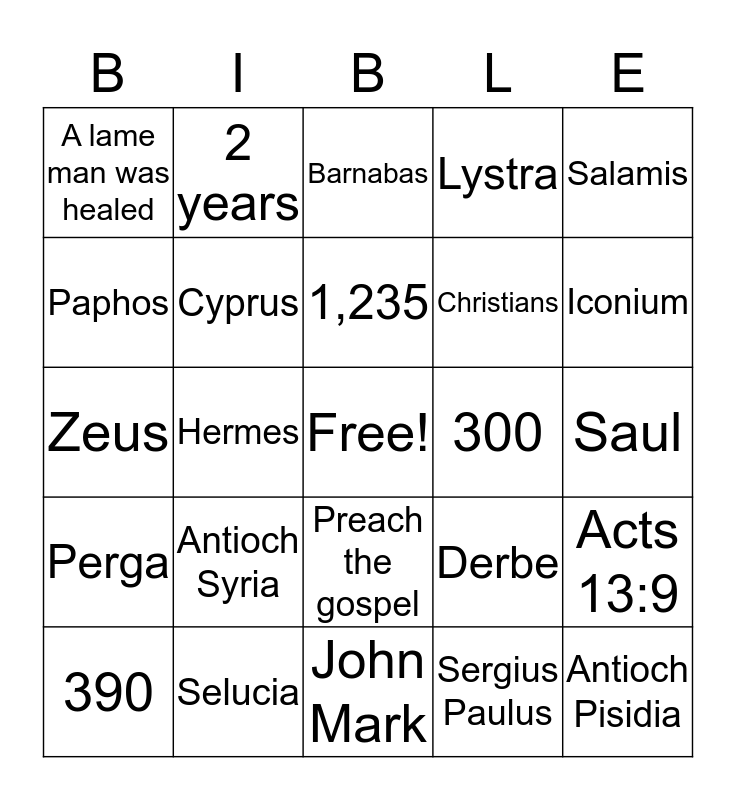 This bingo card has a free space and 24 words: Antioch Syria, Selucia, 1,235, 390, Salamis, A lame man was healed, Paphos, 2 years, 300, Preach the gospel, Christians, Zeus, Derbe, Acts 13:9, Cyprus, Sergius Paulus, Saul, Barnabas, Iconium, Hermes, Antioch Pisidia, Perga, Lystra and John Mark.
