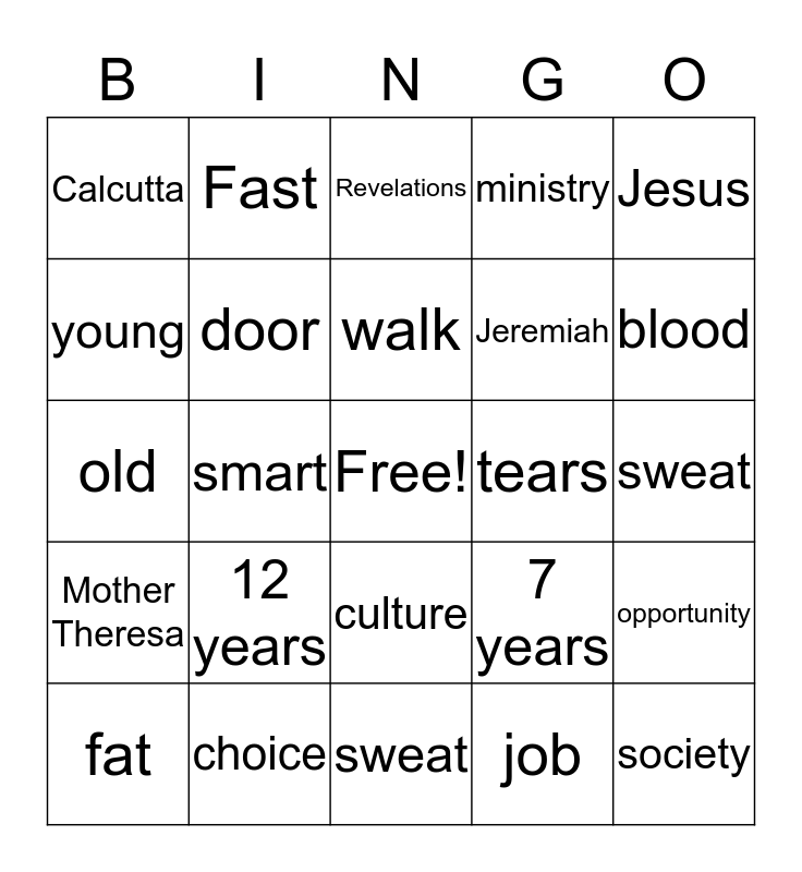 This bingo card has a free space and 24 words: 12 years, choice, walk, fat, Jesus, Calcutta, young, Fast, tears, culture, Jeremiah, old, 7 years, opportunity, door, job, sweat, Revelations, blood, smart, society, Mother Theresa, ministry and sweat.