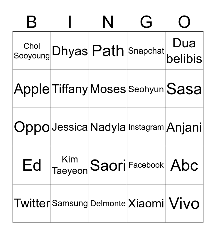 This bingo card has a free space and 24 words: Kim Taeyeon, Samsung, Moses, Twitter, Dua belibis, Choi Sooyoung, Apple, Dhyas, Instagram, Saori, Seohyun, Oppo, Facebook, Abc, Tiffany, Xiaomi, Anjani, Path, Sasa, Jessica, Vivo, Ed, Snapchat and Delmonte.
