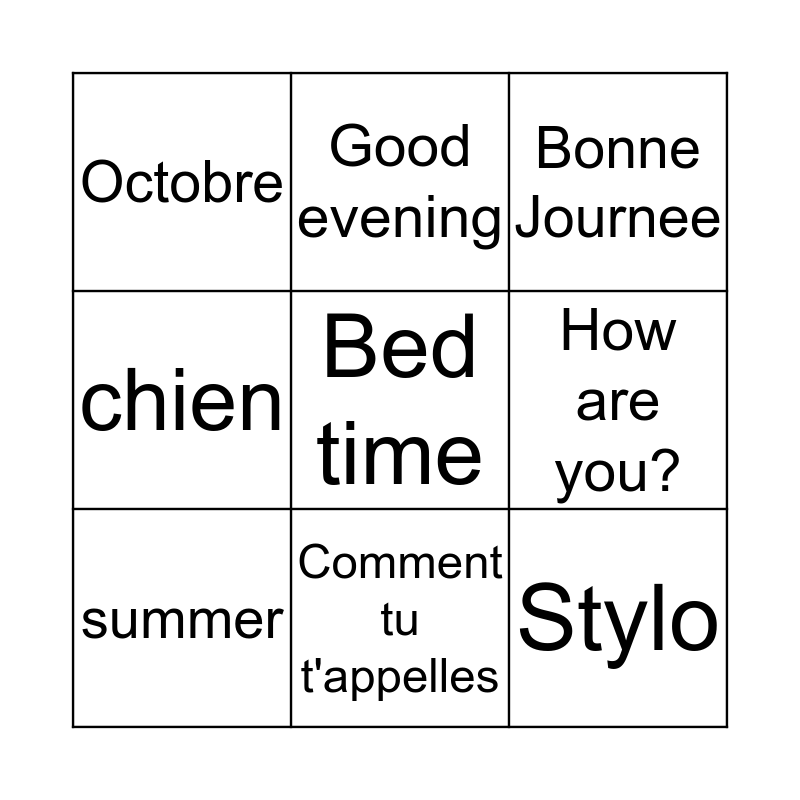 This bingo card has a free space and 26 words: Meilleurs aim, Drink, Comment tu t'appelles, Je t'aime, Stylo, Octobre, How are you?, Good evening, Hello, Bienvenue, Sunday, How old are you?, Thank you, danse, météo, école, chien, Happy Birthday, Bonne Journee, Please, eau, Good bye, Shops, dîner, summer and cat.